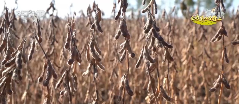 在北大荒集团鹤山农场的大豆田里,先进的大型联合收获机正在高效作业,收割、脱粒、秸秆粉碎还田全靠它,满载金黄豆粒的运输车辆在田间穿行。