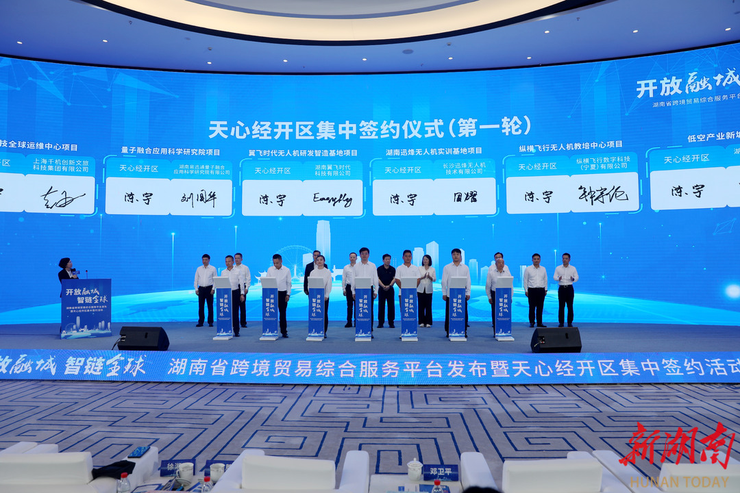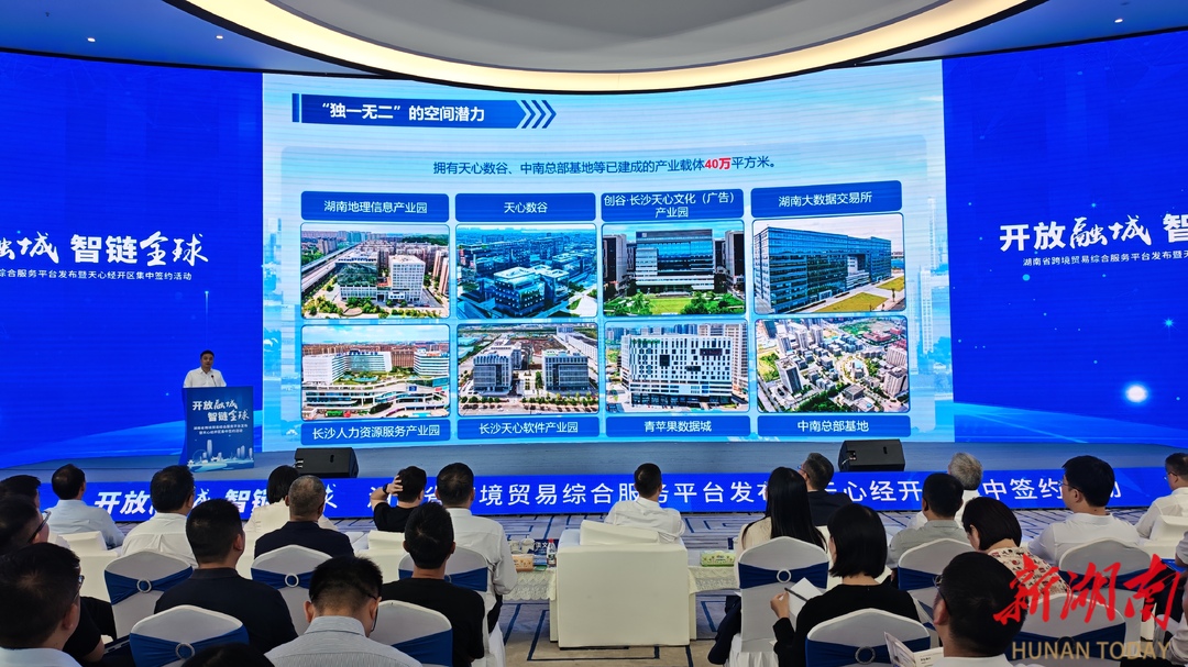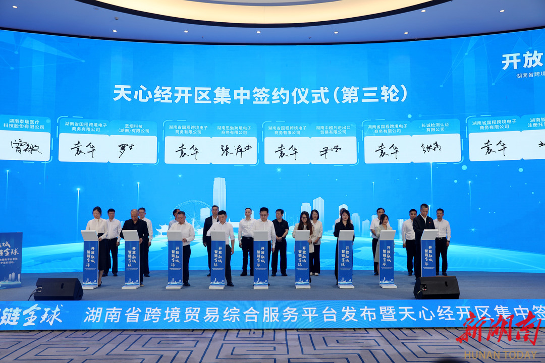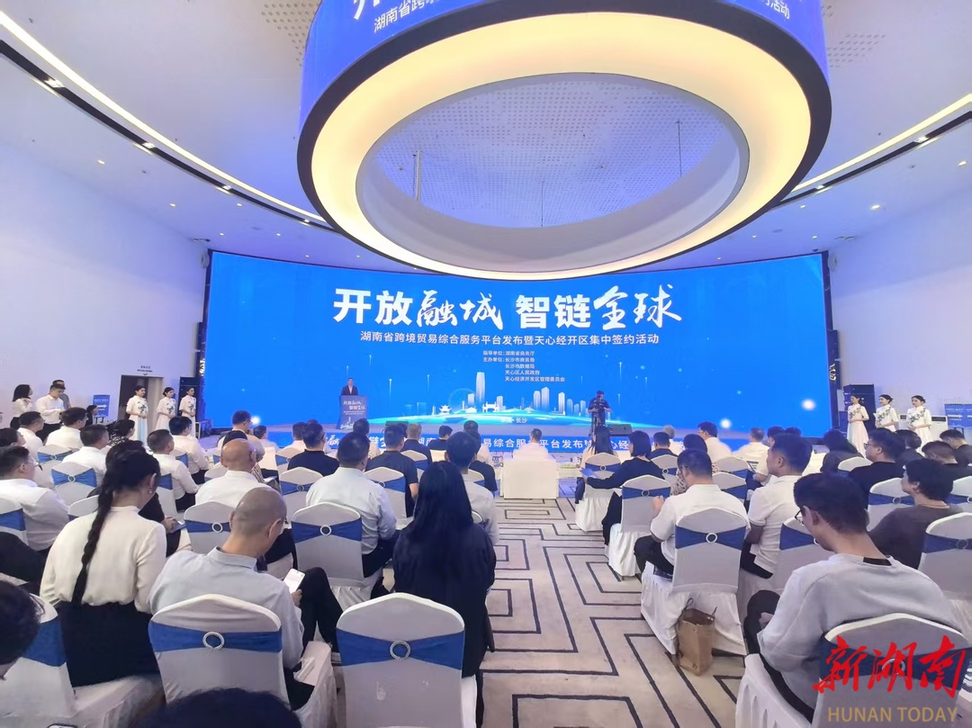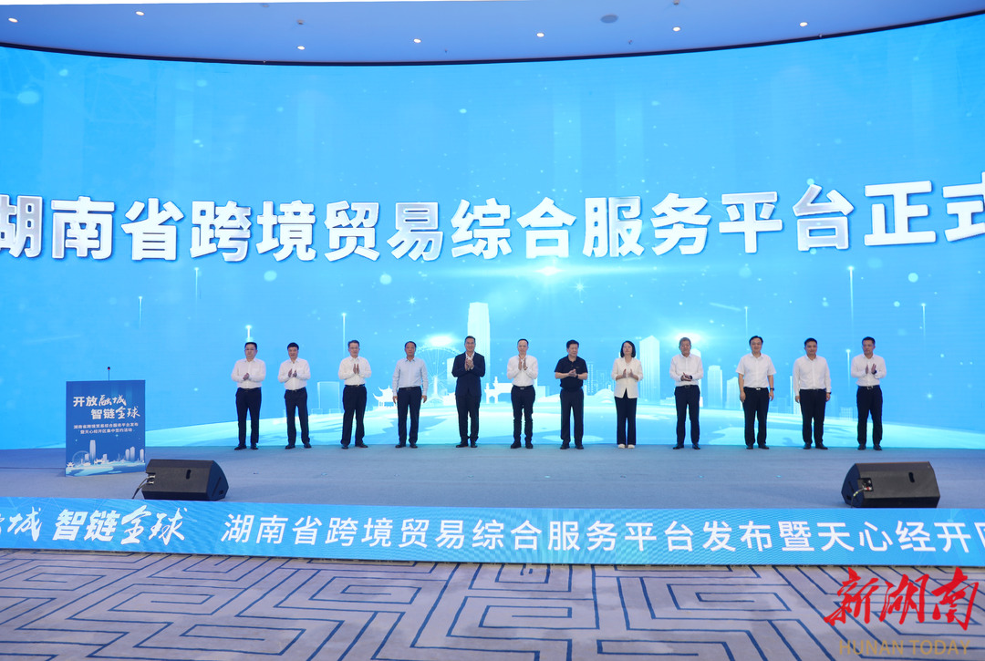 湖南省地质院党委书记谈文胜,省商务厅党组成员、副厅长邓卫平,长沙市人民政府党组成员、副市长郑平等出席。现场,湖南省跨境贸易综合服务平台宣布上线、天心经开区最高千万扶持政策发布、重点企业集中签约。